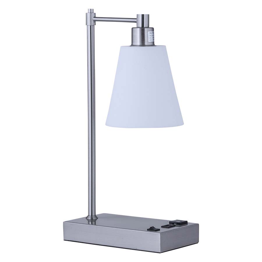 18"H Brushed Nickel Table Lamp, medium base socket, on/off rocker base switch, one convenience outlet, one USB port, 12' Silver 45° 3-prong grounded cord, with White Frosted Glass Shade. Recommend 1100 lumen LED bulb.