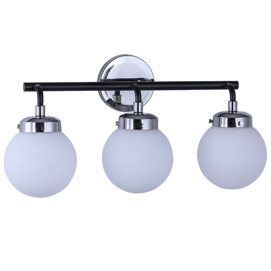 11"H Polished Nickel and Matte Black Wall Lamp, three E12 sockets, Direct Wired, with three Opal Glass Shades, recommend three 5 watt LED Candelabra bulbs.