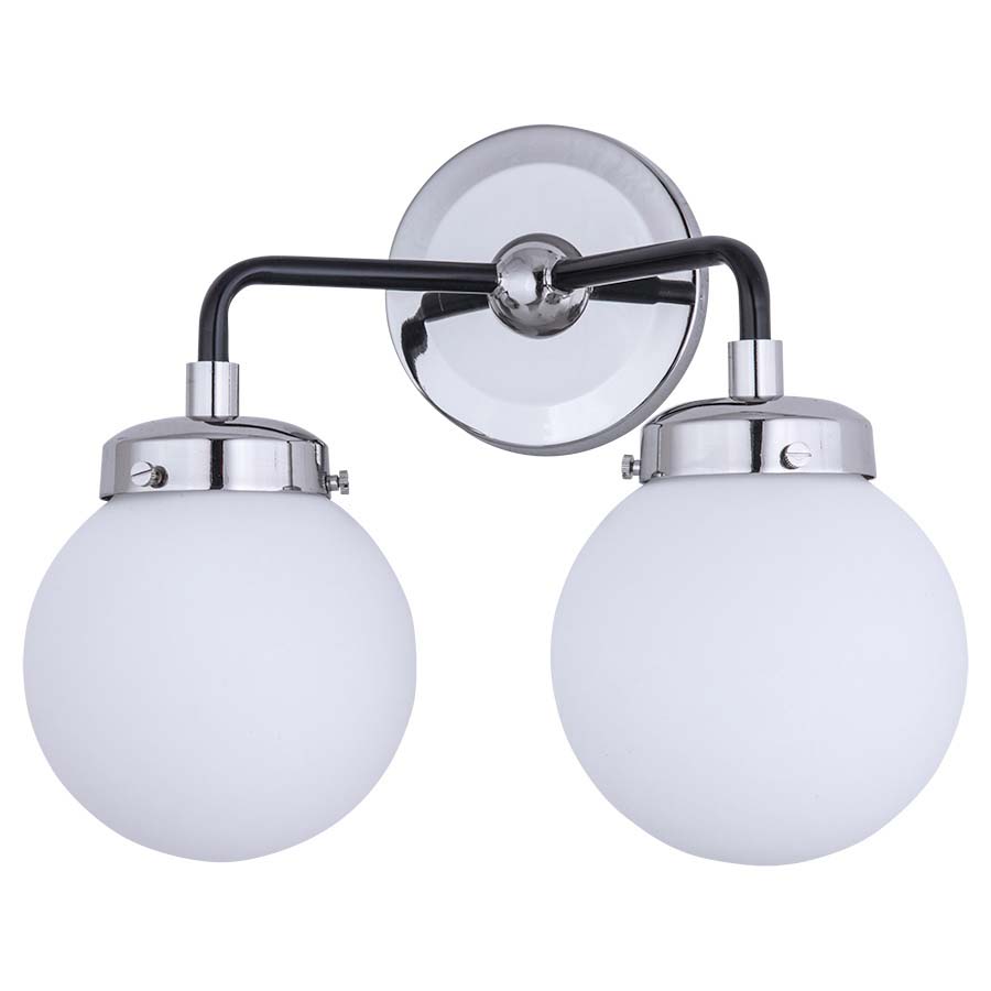 11"H Polished Nickel and Matte Black Double Wall Lamp, two E12 sockets, Direct Wired, with two Opal Glass Shades, recommend two 5 watt LED Candelabra bulbs.