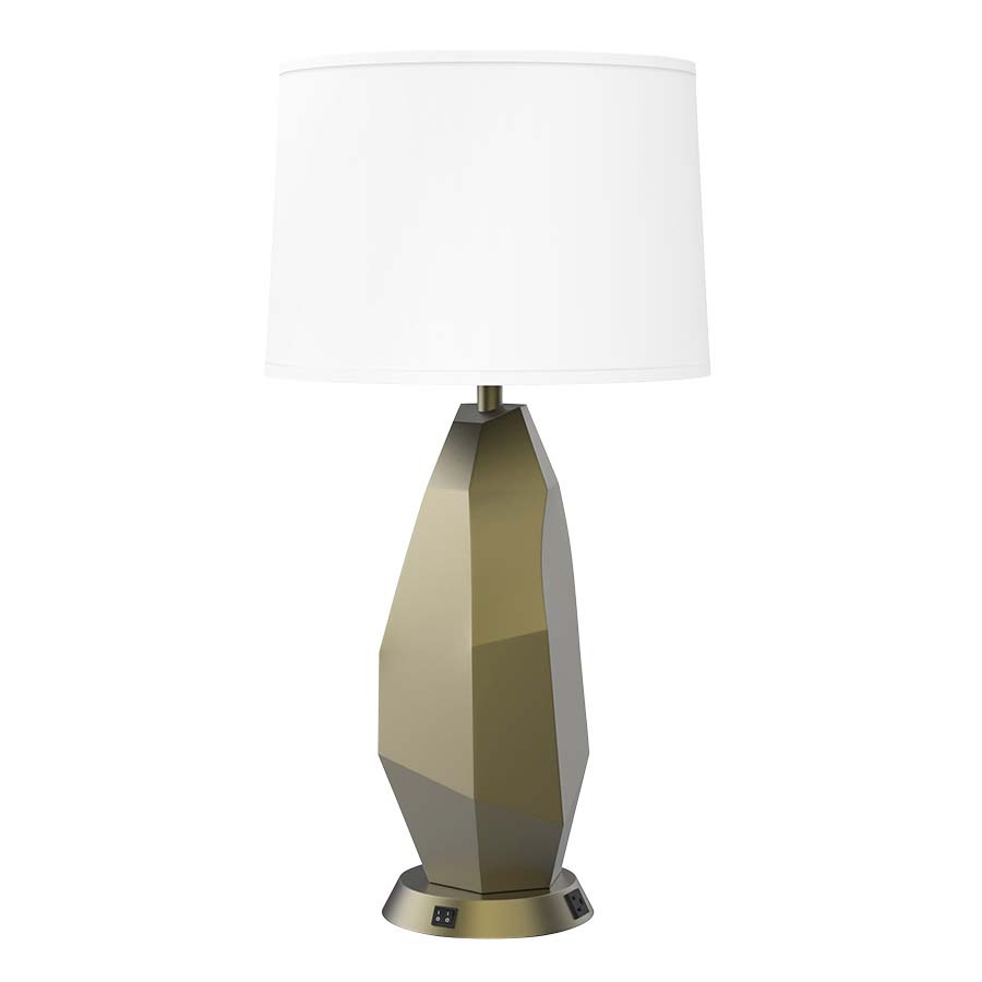 Need a nightstand lamp for a hotel lighting project? Arkansas Lighting's gold 31" table lamp features a unique geometric base with two outlets.
