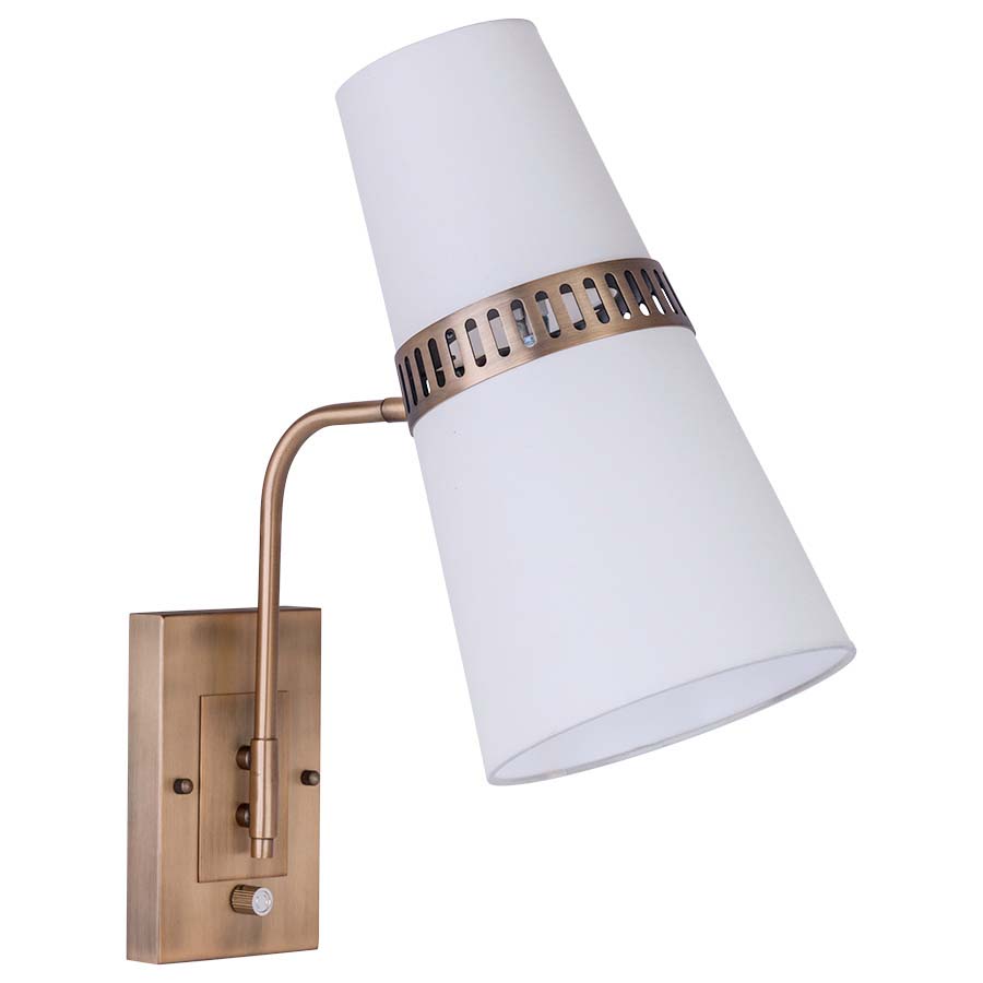 18.5"H Dark Antique Brass Wall Lamp, two E12 sockets, dimmer switch, 8' Silver 45° cord, 30" matching cordcover, with Parchment Linen Shade. Recommend two 5 watt LED Candelabra bulbs.