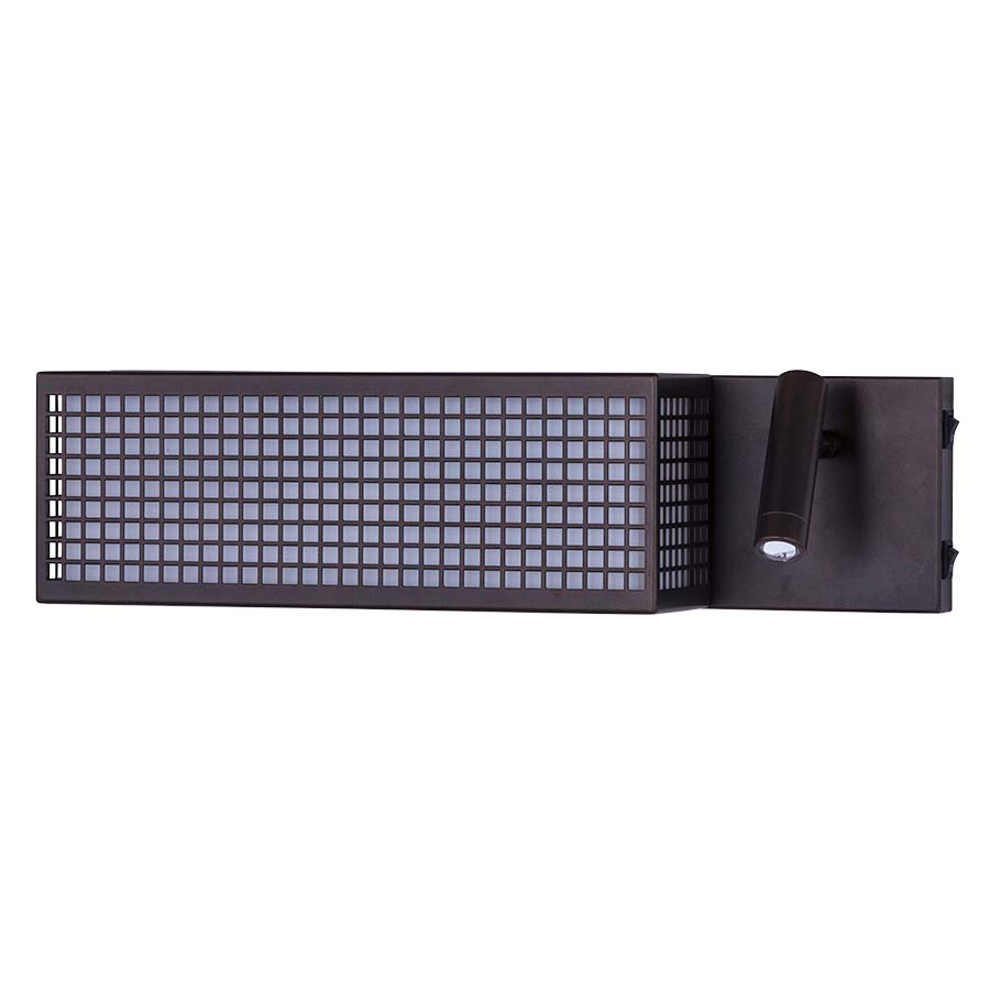 19"W Painted Olde Bronze Wall Lamp, two medium base sockets & 1-3 watt integrated LED, direct wired, two on/off rocker switches on right side, with a perforated metal grid and a white frosted acrylic diffuser. Recommend two 1100 lumen LED bulbs.