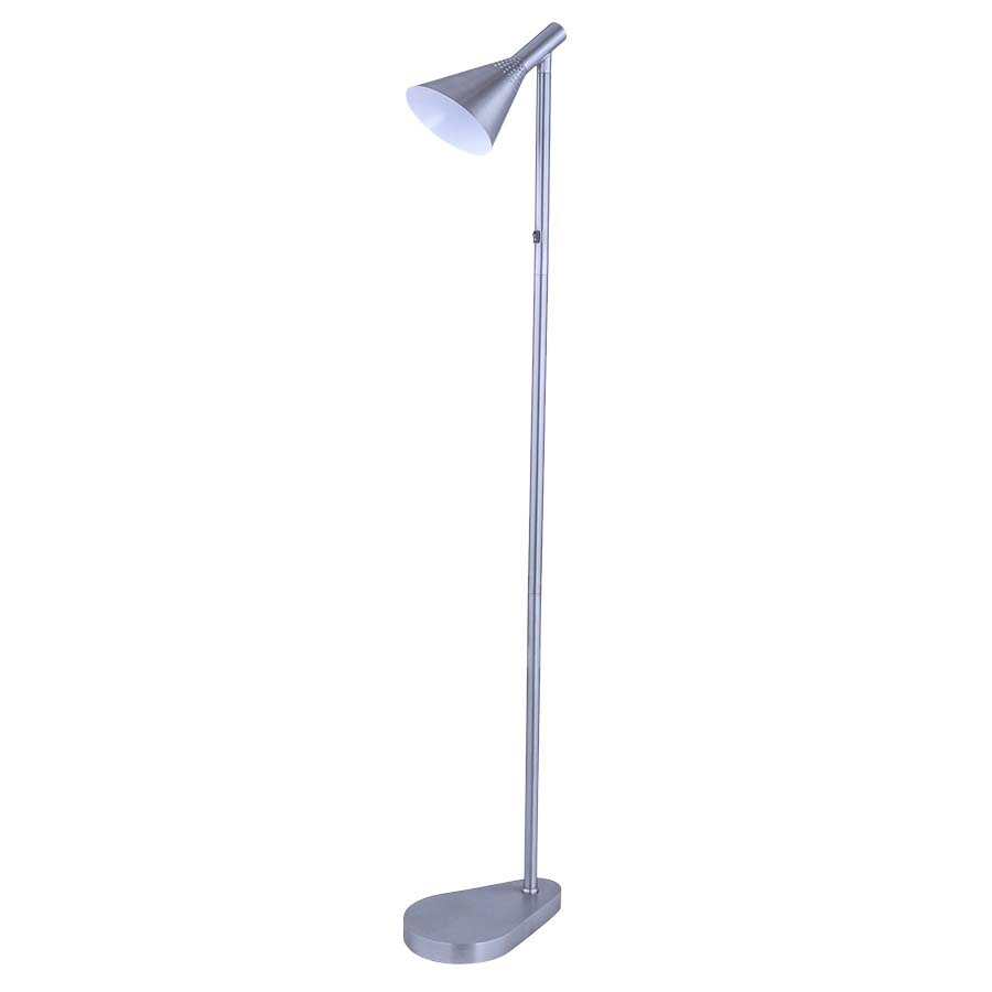 61.5" Satin Brushed Smoke Aluminum Floor Lamp, medium base socket, on/off rocker switch on column at 48" AFF, 5' Silver 45° cord, Metal Shade with perforations and powder coat white interior. Recommend 1100 lumen LED bulb.