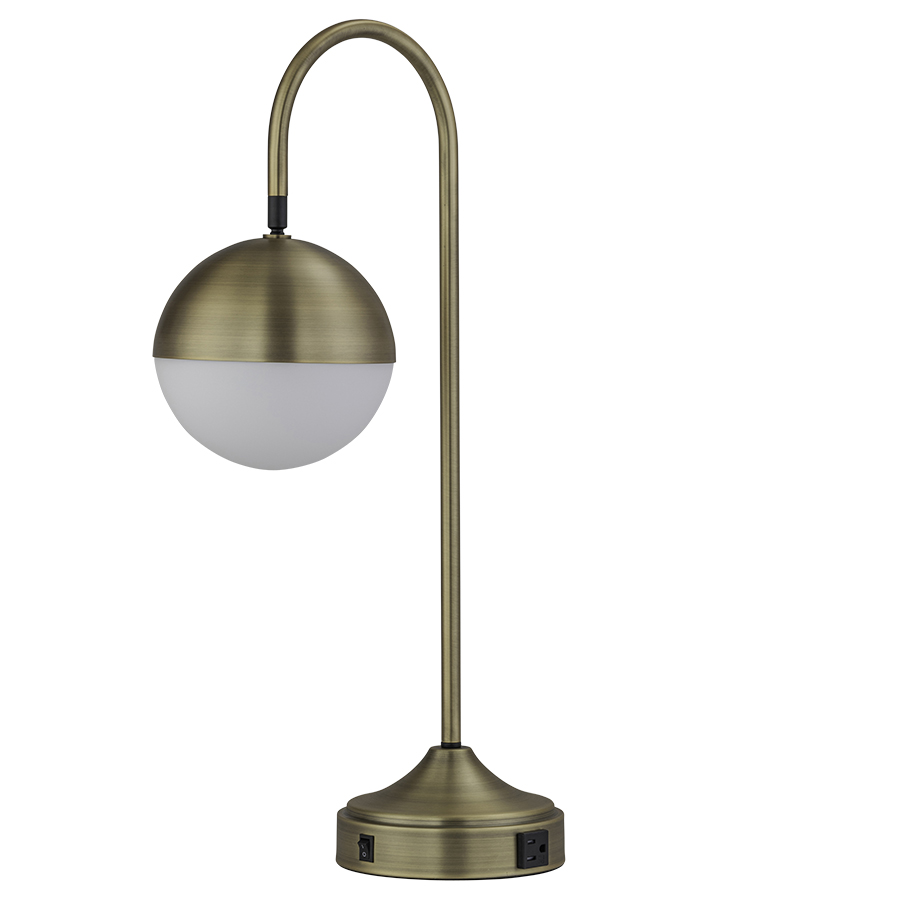 26"H Brushed Brass with Matte Black accents Table Lamp, medium base socket, on/off rocker base switch, 2 Outlets, 8' Silver 45° 3-prong grounded cord, Top Metal Shade with Bottom Opal Matte Glass Globe. Recommend 1100 lumen LED bulb