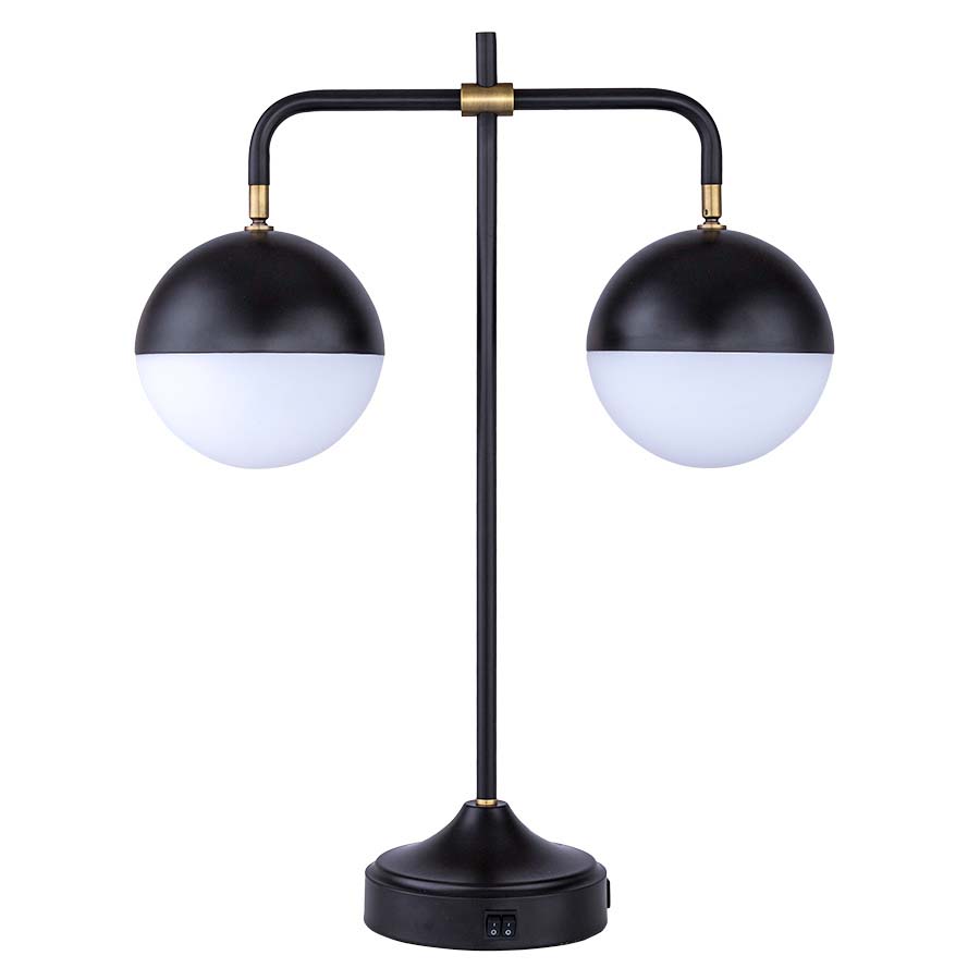 26"H Pottery Bronze Table Lamp with Brushed Brass accents, two medium base sockets, dual on/off rocker base switch, dual USB port, 8' Black 45° cord, two Top Metal Shades with Bottom Opal Matte Glass Globes. Recommend two 1100 lumen LED bulbs