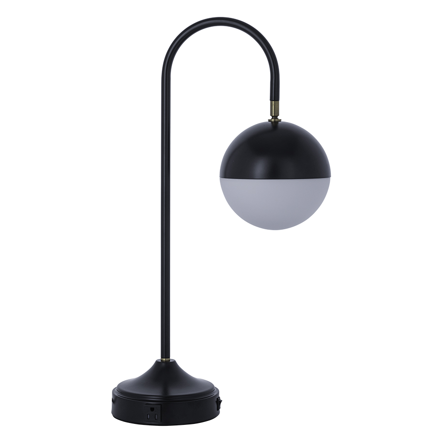 26"H Pottery Bronze Table Lamp with Brushed Brass accents, medium base socket, on/off rocker base switch, one outlet, dual USB port, 8' Black 45° 3-prong grounded cord, Top Metal Shade with Bottom Opal Matte Glass Globe. Recommend 1100 lumen LED bulb