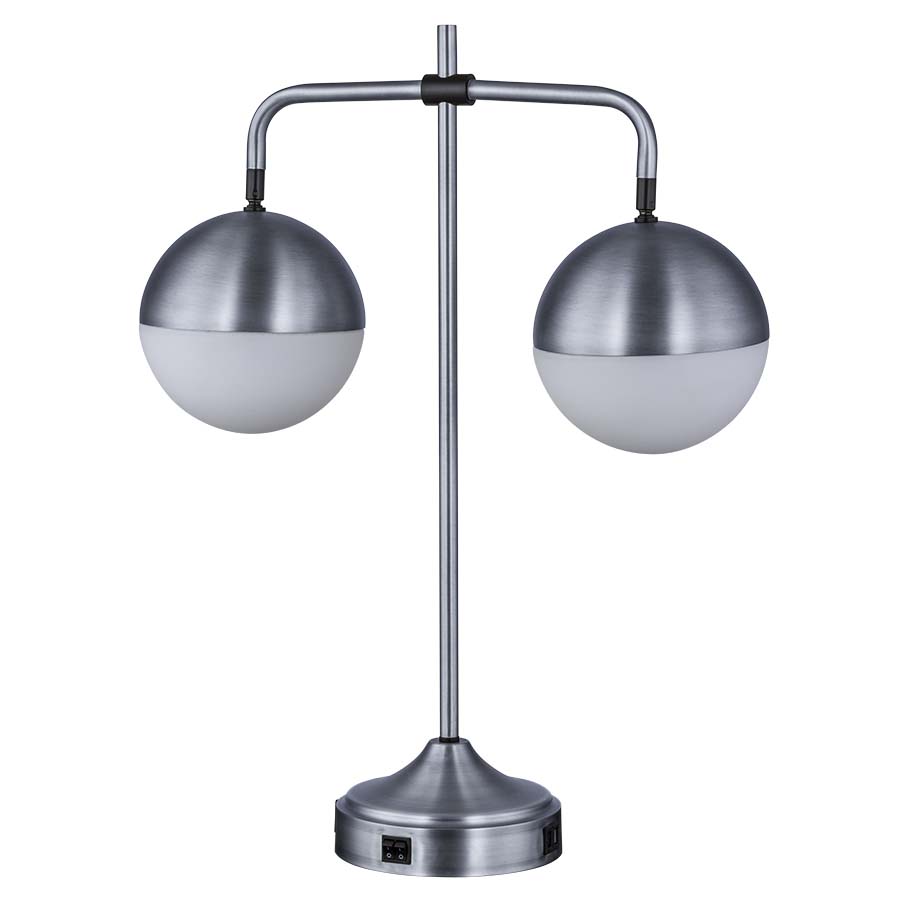 26"H Brushed Nickel with Pottery Bronze Accents Table Lamp, 2- medium base sockets, dual on/off rocker base switch, 1-outlet, dual USB port, 8'Silver45°3-prong grounded cord, two Top Metal Shades with Bottom Opal Matte Glass Globes. Recommend 2-1100 lumen LED bulbs