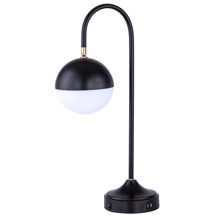 26"H Brushed Nickel Table Lamp, medium base socket, on/off rocker base switch, 1-outlet, dual USB port, 8' Silver 45° 3-prong grounded cord, Top Metal Shade with Bottom Opal Matte Glass Globe. Recommend 1100 lumen LED bulb