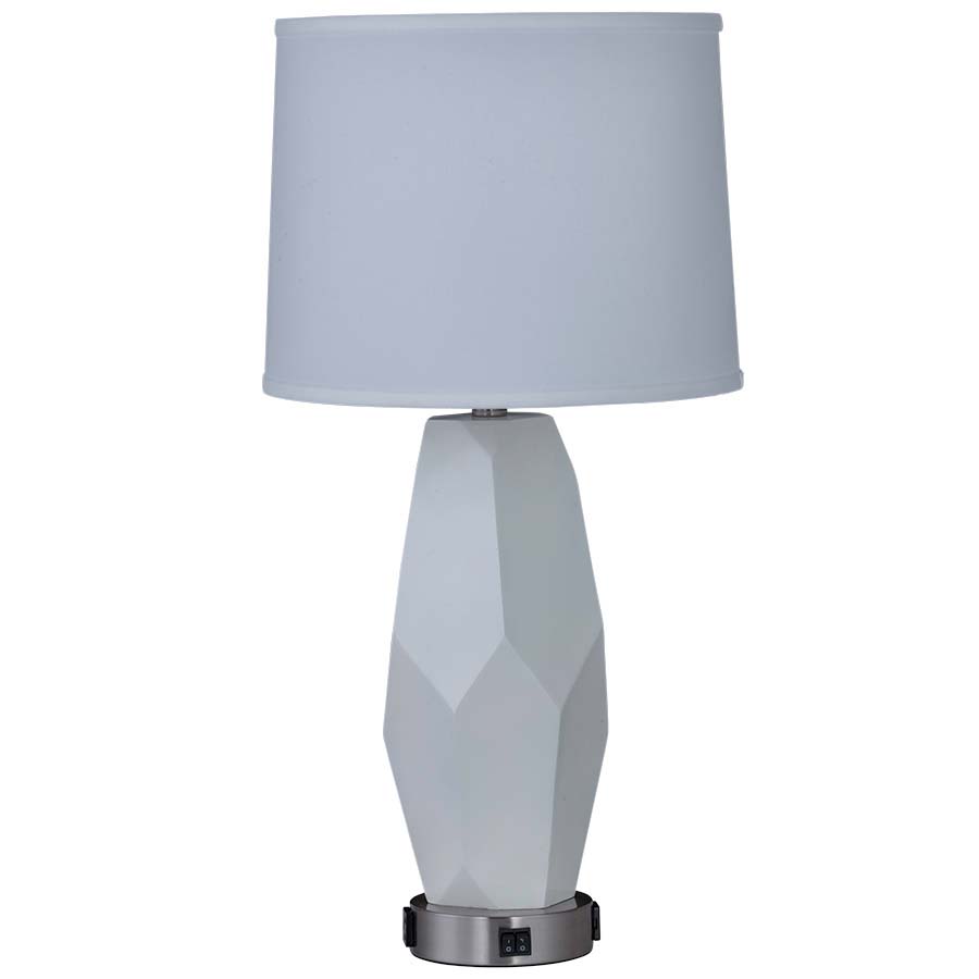 Need a nightstand lamp for a hotel lighting project? Arkansas Lighting's pure white resin 28" table lamp features a unique geometric base with two outlets.