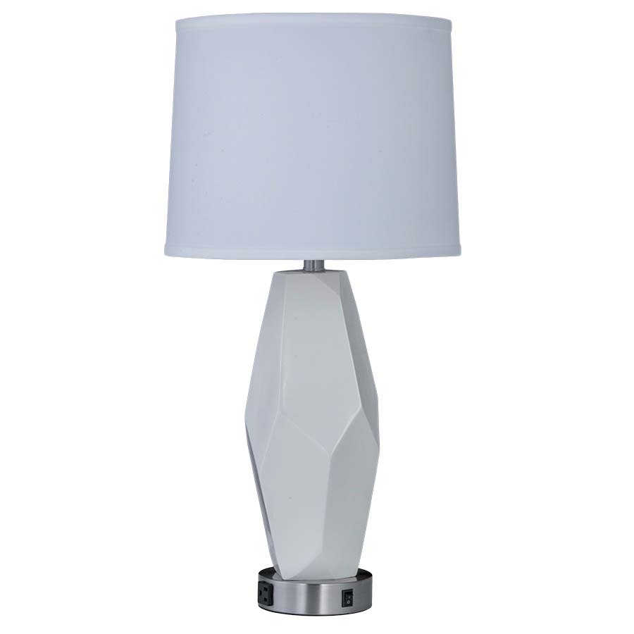 28"H Pure White Resin and Brushed Nickel Table Lamp, medium base socket, one outlet, on/off rocker base switch, 8' Silver 45° 3-prong grounded cord, Includes a 13x14x11 White Linen Hardback Shade with top diffuser, recommend 1100 lumen LED bulb