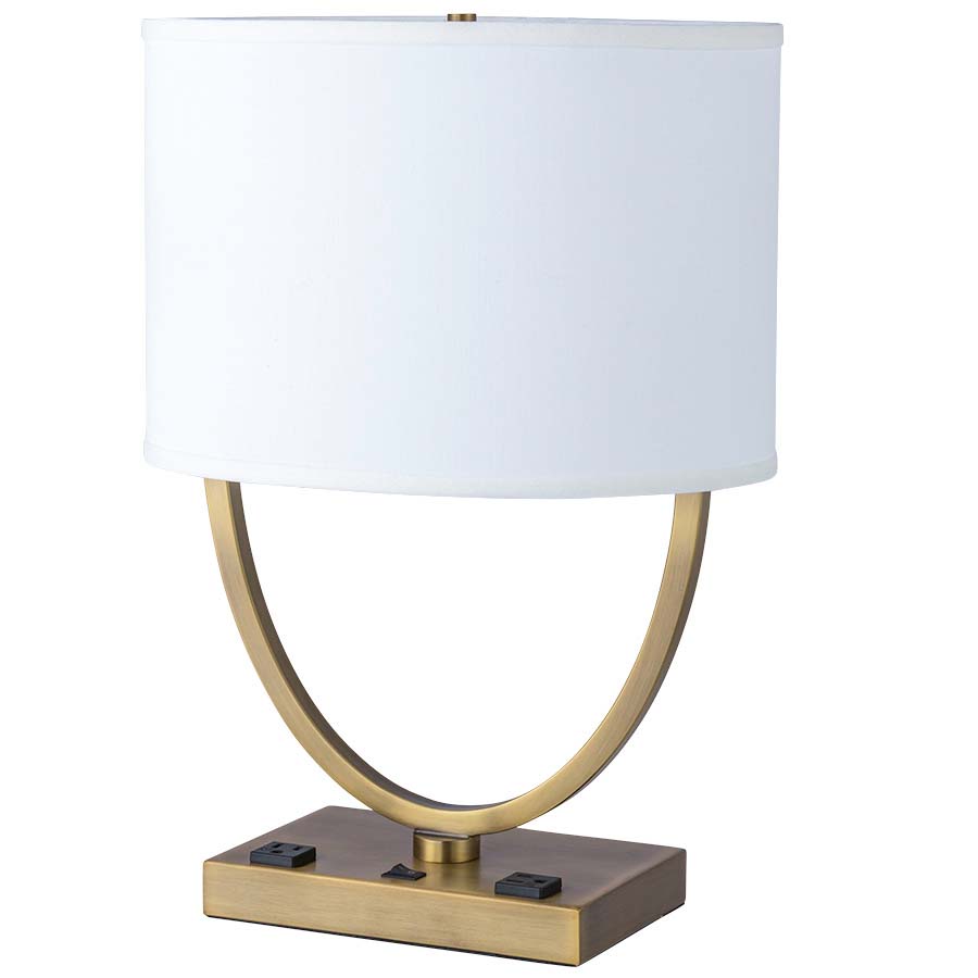 20"H Light Antique Brass Table Lamp, dual medium base socket, one on/off rocker base switch, two outlets, 8' Silver 45° cord, 10"x14"x10"x14"x9.5" Oval Cream Linen Hardback Shade with top acrylic diffuser, recommend two 800 lumen LED bulbs