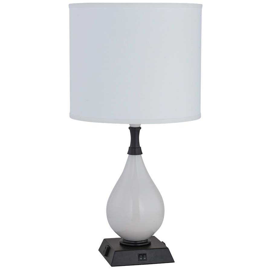 27-7/8"H Oil Rubbed Bronze and Ivory ceramic Table Lamp, "S" arm medium base socket, dual on/off rocker base switch, two outlets, 8' Silver 45° 3-prong grounded cord, 14"x14"x12" Cream Linen Hardback Shade with top acrylic diffuser, recommend two 800 lumen LED bulbs