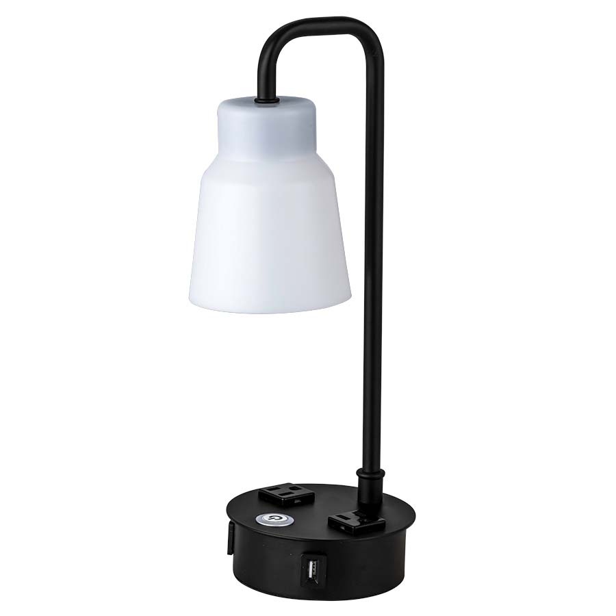 14"H Black Integrated LED Table Lamp, 8 watt LED, 450 lumen, 3000K, 85CRI, touch dimmer switch on base, two outlets,two USB ports, 6.5' Black 45° 3-prong grounded cord, with White Frosted Acrylic Shade