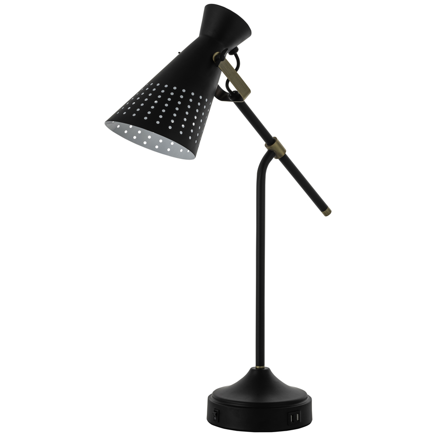 28"H Matte Black Table Lamp with Brushed Brass accents, medium base socket, on/off rocker base switch, dual USB port, 8' Black 45° cord, with a partially perforated metal shade, recommend 1100 lumen LED bulb