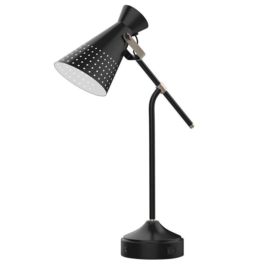 28"H Pottery Bronze Table Lamp with Brushed Brass accents, medium base socket, on/off rocker base switch, dual USB port, 8' Black 45° cord, with a partially perforated metal shade, recommend 1100 lumen LED bulb