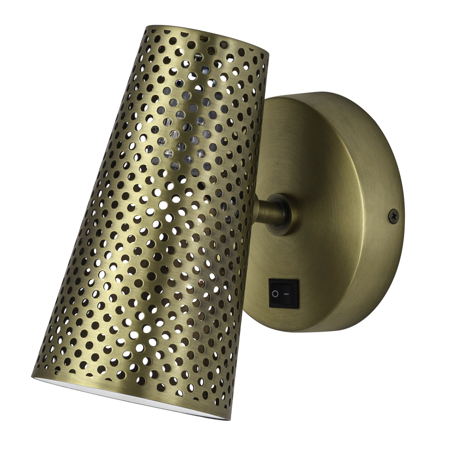 7.75"H Brushed Brass Wall Lamp, medium base socket, on/off rocker switch at backplate, 8' Silver 45° cord exiting out back of lamp, with a perforated metal shade with bottom acrylic diffuser, recommend 800 lumen LED bulb.