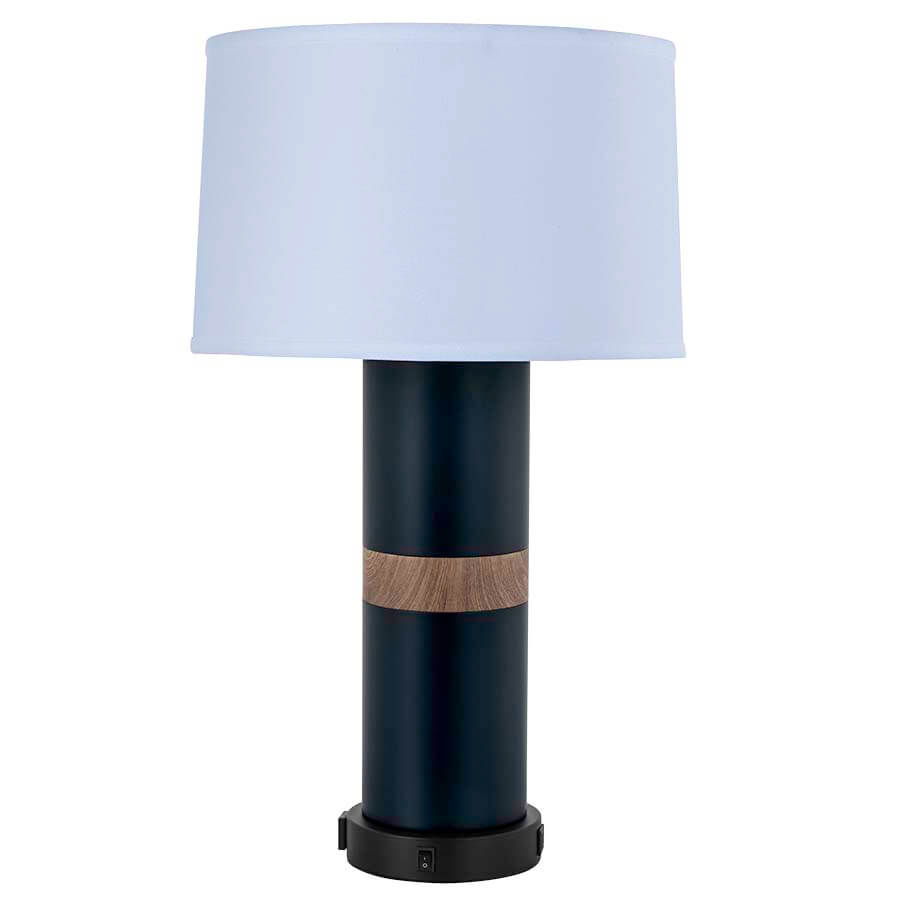 27" Gale Force and Matte Black Table Lamp with a Water Transfer Bleached Legno accent piece, medium base socket, on/off rocker base switch, one outlet, one USB port and one USB-C port, 10' Silver 45° 3-prong grounded cord, 15"x16"x10" White Linen Hardback Shade, recommend 1100 lumen LED bulb