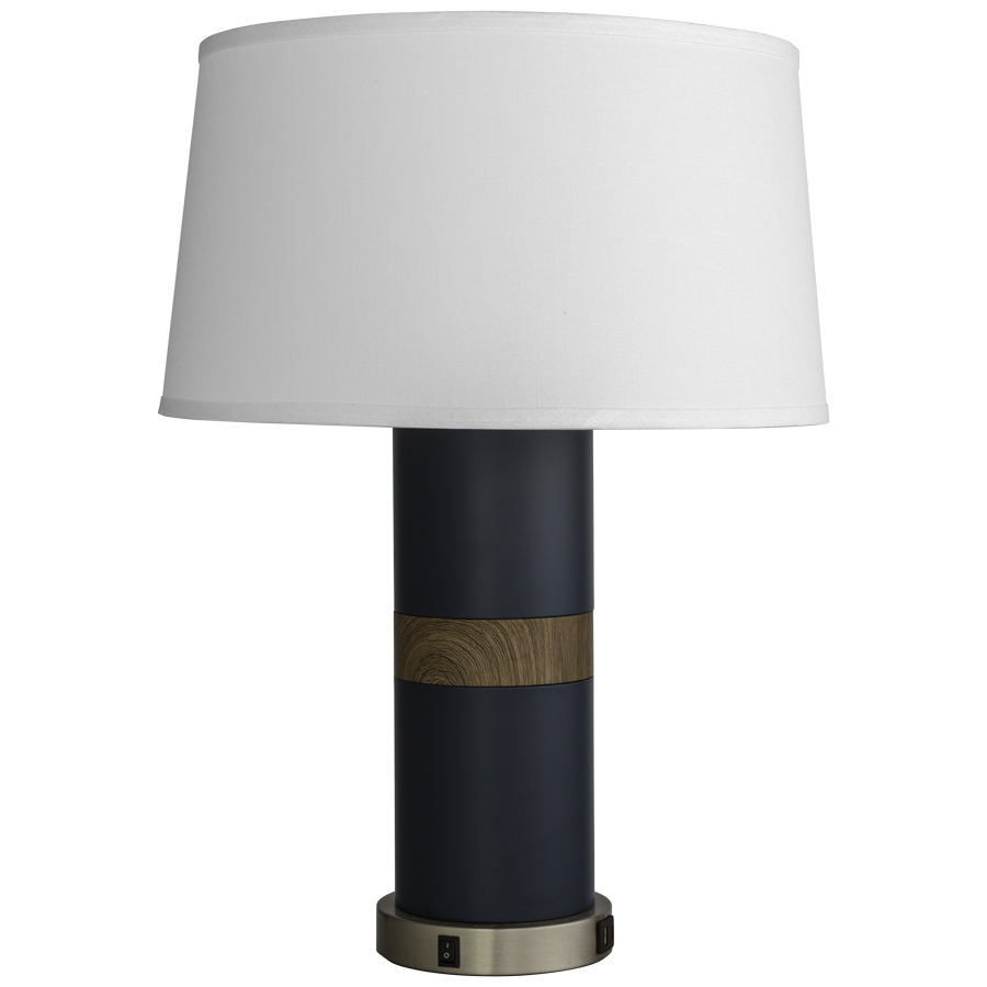 25" Gale Force and Brushed Nickel Table Lamp with a water transfer Oak accent piece, medium base socket, on/off rocker base switch, dual USB A + C port, 8' Silver 45° cord, includes 16"x18"x10" White Linen Hardback Shade, recommend 1100 lumen LED bulb