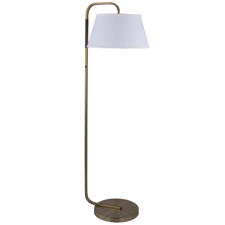 60"H Antique Brushed Brass Floor Lamp, with Caramel Leather accent piece, E26 socket, on/off rocker switch on inside of column at 42"AFF, 8' Silver 45° cord, 12"x17"x9" White Linen Hardback Shade with Rolled Edges, recommend 1100 lumen LED bulb.