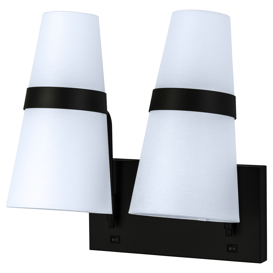 18.5"H Matte Black Wall Lamp, four medium base sockets, two on/off rocker switches at backplate, 8' Silver 45° cord exiting out back of lamp, two 4"x7.5"x13.75" white linen shades with rolled edges. Recommend four 1100 lumen LED bulbs.
