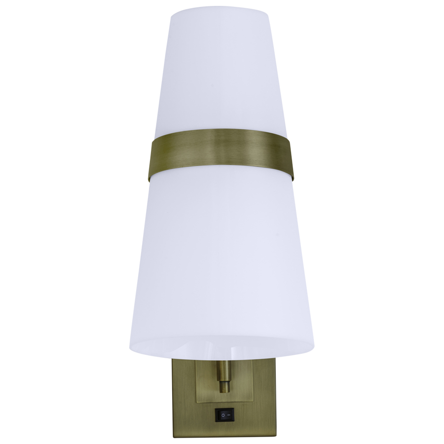 18.5"H Brushed Brass Wall Lamp, two medium base sockets, on/off rocker switch at backplate, 8' Silver 45° cord exiting out back of lamp, 4"x7.5"x13.75" White Frosted Acrylic Shade. Recommend two 1100 lumen LED bulbs.