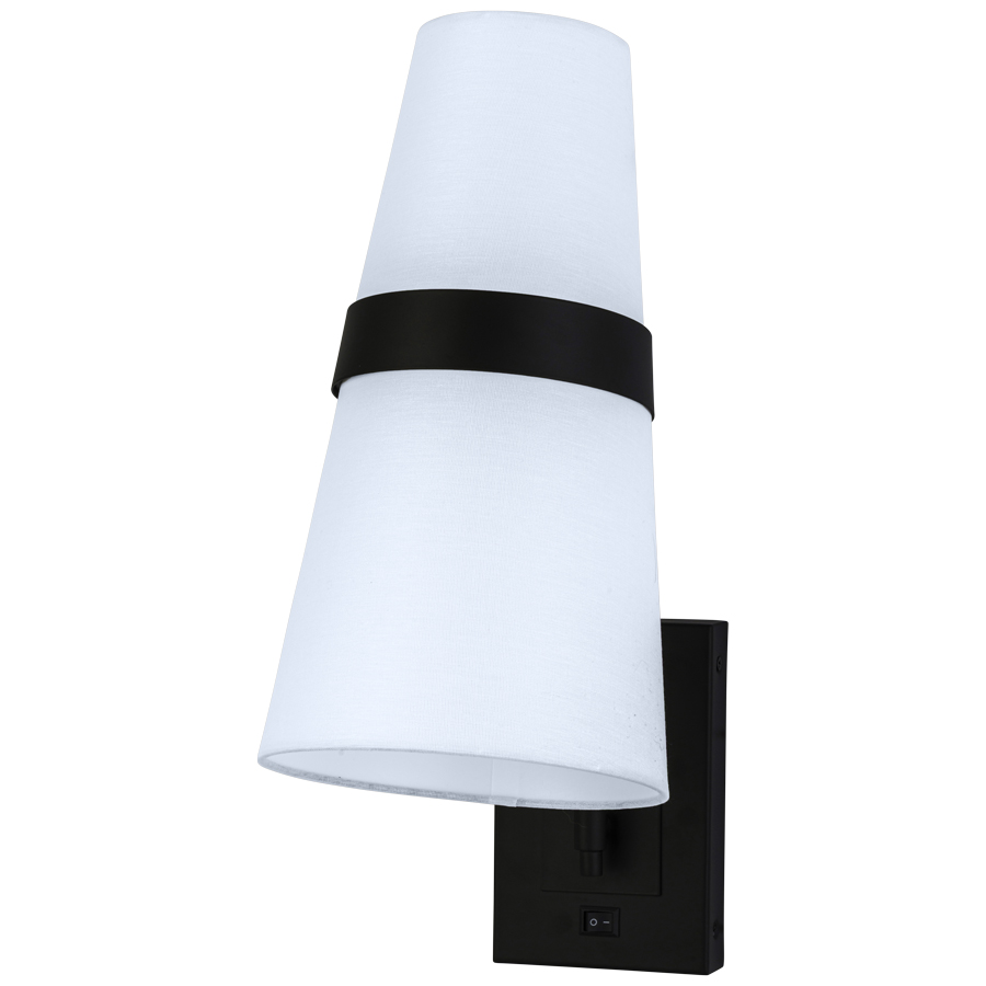 18.5"H Matte Black Wall Lamp, two medium base sockets, on/off rocker switch at backplate, 8' Silver 45° cord exiting out back of lamp, 4"x7.5"x13.75" white linen shade with rolled edges. Recommend two 1100 lumen LED bulbs.