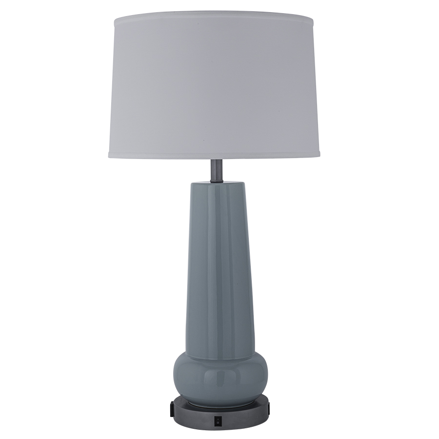 33"H Raindrop Ceramic and Metallic Silver Table Lamp, medium base socket, on/off rocker base switch, 8' Silver 45° 3-prong grounded cord, one outlet, dual USB port, 16"x17"x11" White Linen Hardback Shade. Recommend 1100 lumen LED bulb.