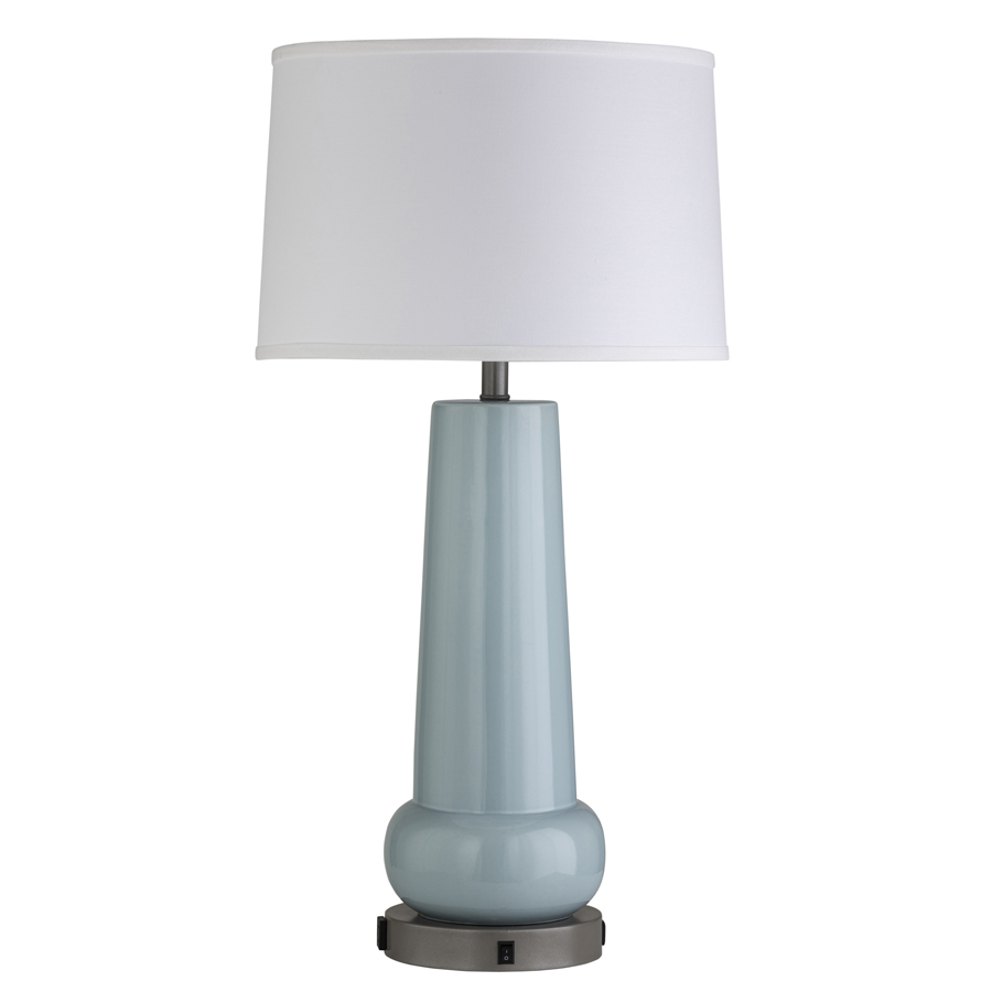 33"H Raindrop Ceramic and Stainless Steel Table Lamp, medium base socket, on/off rocker base switch, 8' Silver 45° 3-prong grounded cord, one outlet, one USB and one USB-C port, 16"x17"x11" White Linen Hardback Shade. Recommend 1100 lumen LED bulb.