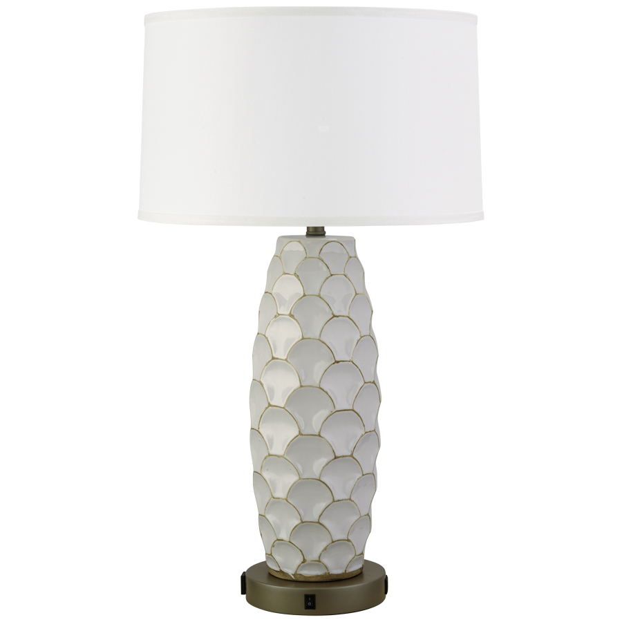 33"H White and Favorite Tan Ceramic and Powder Coat Champagne Table Lamp, medium base socket, on/off rocker base switch, one outlet, dual USB port, 8' Silver 45° 3-prong grounded cord, 18"x19"x11" White Linen Hardback Shade, recommend 1100 lumen LED bulb