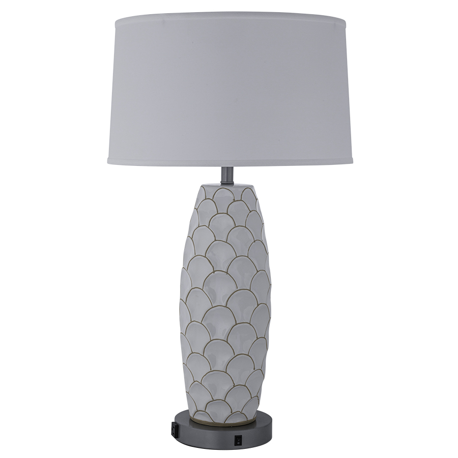 33"H White and Favorite Tan Ceramic and Metallic Silver Table Lamp, medium base socket, on/off rocker base switch, one outlet, dual USB port, 8' Silver 45° 3-prong grounded cord, 18"x19"x11" White Linen Hardback Shade, recommend 1100 lumen LED bulb
