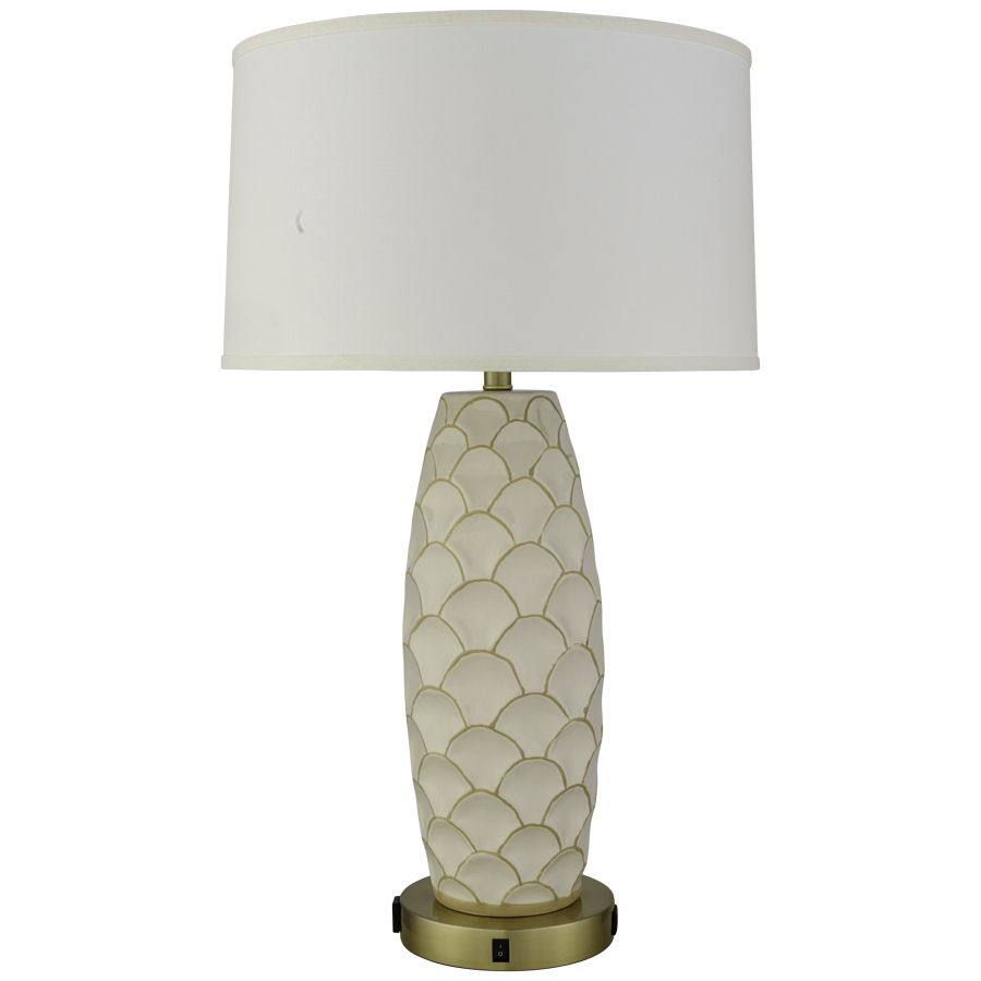 33"H Cream and Favorite Tan Ceramic and Satin Brushed Brass Table Lamp, medium base socket, on/off rocker base switch, one outlet, dual USB A + C port, 8' Silver 45° 3-prong grounded cord, 18"x19"x11" Cream Linen Hardback Shade, recommend 1100 lumen LED bulb