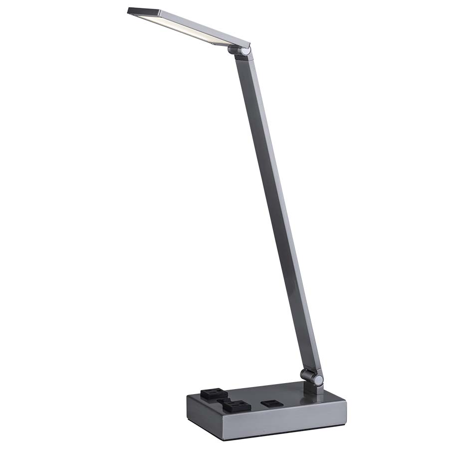 20"H Brushed Nickel Integrated LED Table Lamp, 7 watt LED, 560 lumen, 3000K, 90CRI, two outlets, dual USB port, on/off rocker base switch, arm swivels 100°, 8' Black 45° 3-prong grounded cord, Metal Box shade that swivels 270°