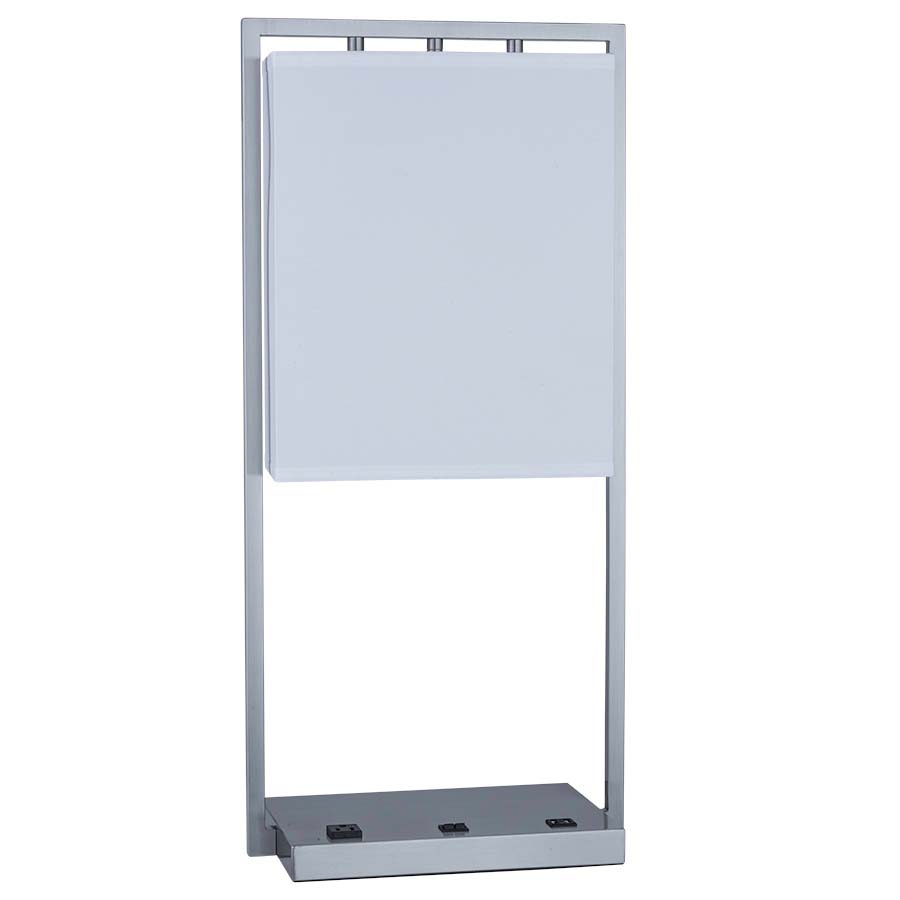 30"H Brushed Nickel Table Lamp, two medium base sockets, dual on/off rocker base switch, one outlet, dual USB port, 8' Silver 45° 3-prong grounded cord, 6"x12"x6"x12"x15" Rectangle White Linen Hardback Shade, recommend two 1100 lumen LED bulbs