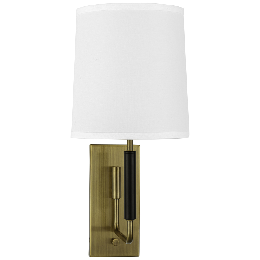 20.75"H Brushed Brass Wall Lamp, Matte Black piece on arm, G9 socket, dimmer switch at backplate, 8' Silver 45° cord exiting out back of lamp, includes 8.5"x9-3/8"x10" White Linen Hardback Shade with top acrylic diffuser. Recommend 8 watt LED G9 bulb.