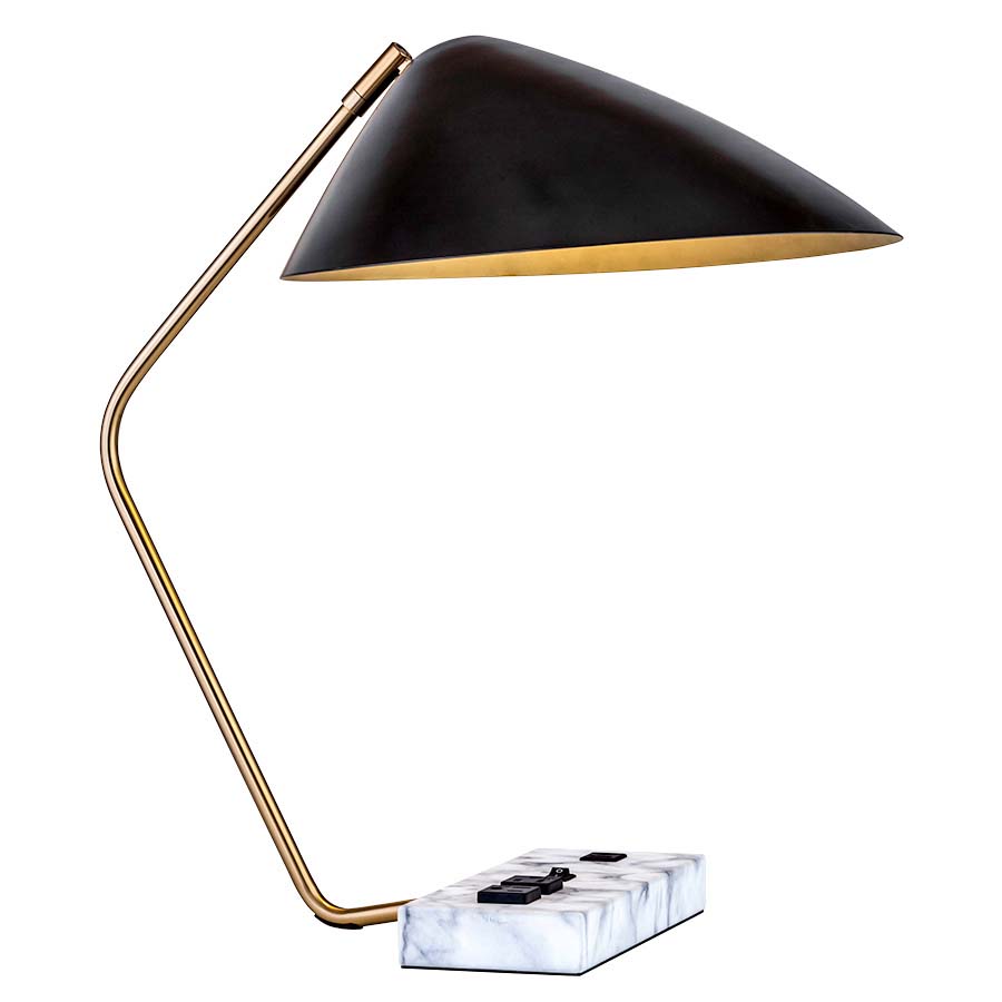 20"H Antique Brushed Brass with a White Marble water transfer base Integrated LED Table Lamp, 13 watt LED, 1200 lumen, 3000K, 90CRI, 120V AC, on/off rocker base switch, two outlets, dual USB port, 8' Silver 45° 3-prong grounded cord, Satin Black metal shade