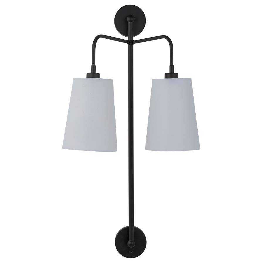 36"H Matte Black Dual-mounted Double Wall Lamp, two medium base sockets, one on/off mini rocker switch on bottom backplate, direct wired, with two 5"x7"x9" White Linen Hardback Shades with Rolled Edges, recommend two 1100 lumen LED bulbs