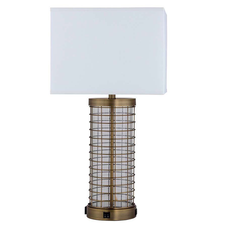 29" Antique Brass and Clear Acrylic Table Lamp, medium base socket, on/off rocker base switch, one outlet, dual USB port, 8' Clear Gold 45° 3-prong grounded cord, 15"x15"x15"x15"x11.5" Square Cream Linen Hardback Shade, recommend 1100 lumen LED bulb