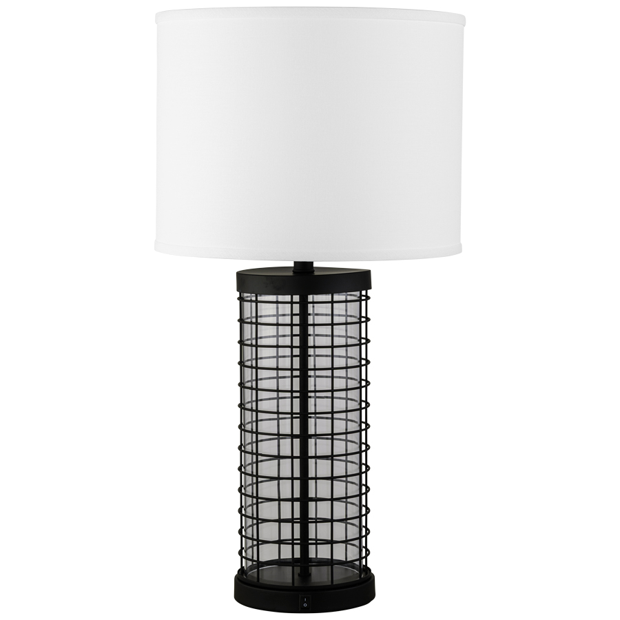 29" Matte Black and Clear Acrylic Table Lamp, medium base socket, on/off rocker base switch, 8' Silver 45° cord, 15"x15"x11.5" White Linen Hardback Shade with top and bottom acrylic diffusers, recommend 1100 lumen LED bulb