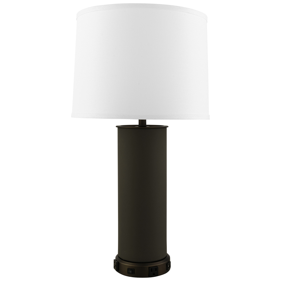 27.75"H Dark Antique Bronze and Faux Dark Gray Leather Wrapped Resin Table Lamp, medium base socket, on/off rocker base switch, two outlets, one USB port, 8' Silver 45° 3-prong grounded cord, 14"x15"x11" White Linen Hardback Shade, recommend 1100 lumen LED bulb.