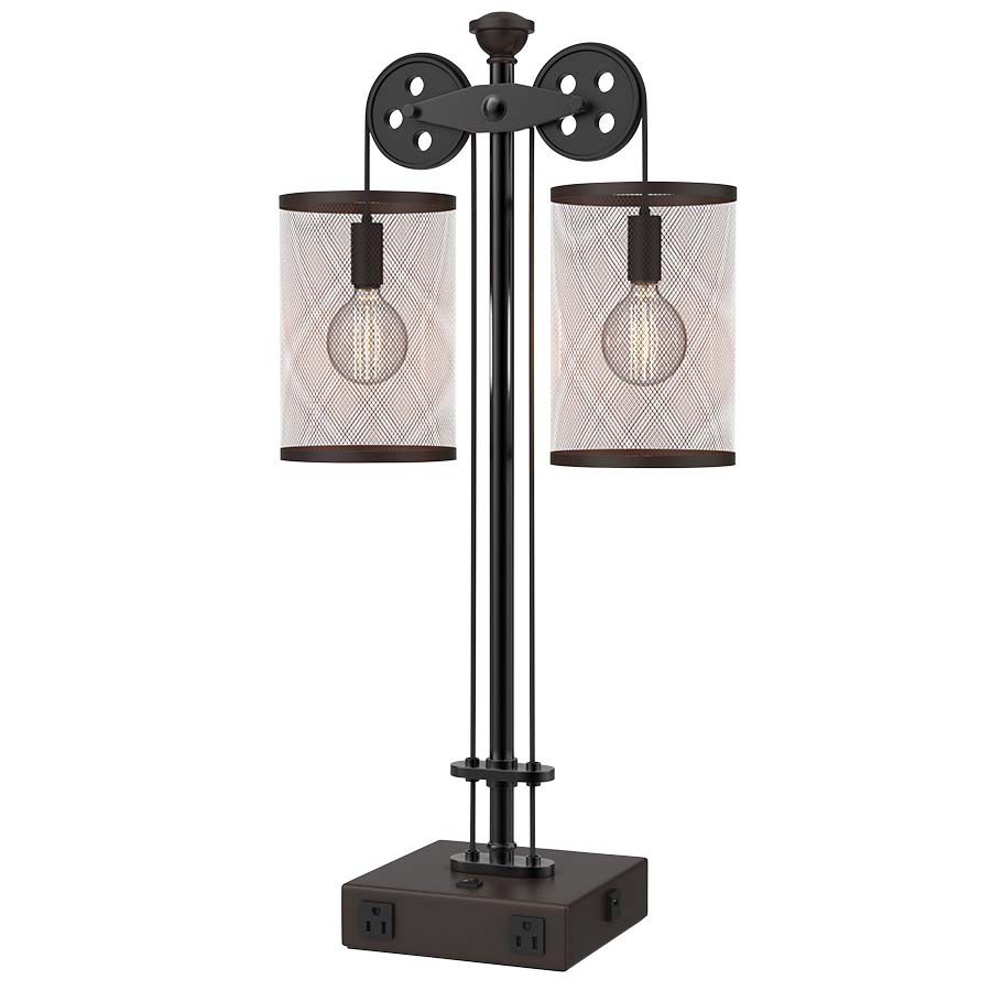 28.75"H Oiled Bronze and Glossy Black Nickel Double Table Lamp, two medium base sockets, one on/off rocker base switch, two outlets, 8' Silver 45° 3-prong grounded cord, two 5.75"x5.75"x8-3/8" Nickel Metal Shades with Oiled Bronze Trim, recommend two 8 watt Clear LED bulbs