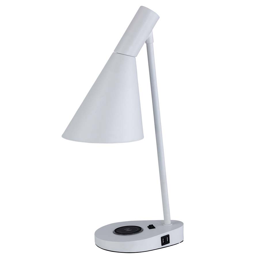 22" Table Lamp shown in Matte White, Medium Based Socket, On and Off Rocker Switch, Dual USB Port, Wireless Charging Pad, 8' Silver 45° 3-Prong Grounded Cord, with a Matching Metal Hooded Shade.