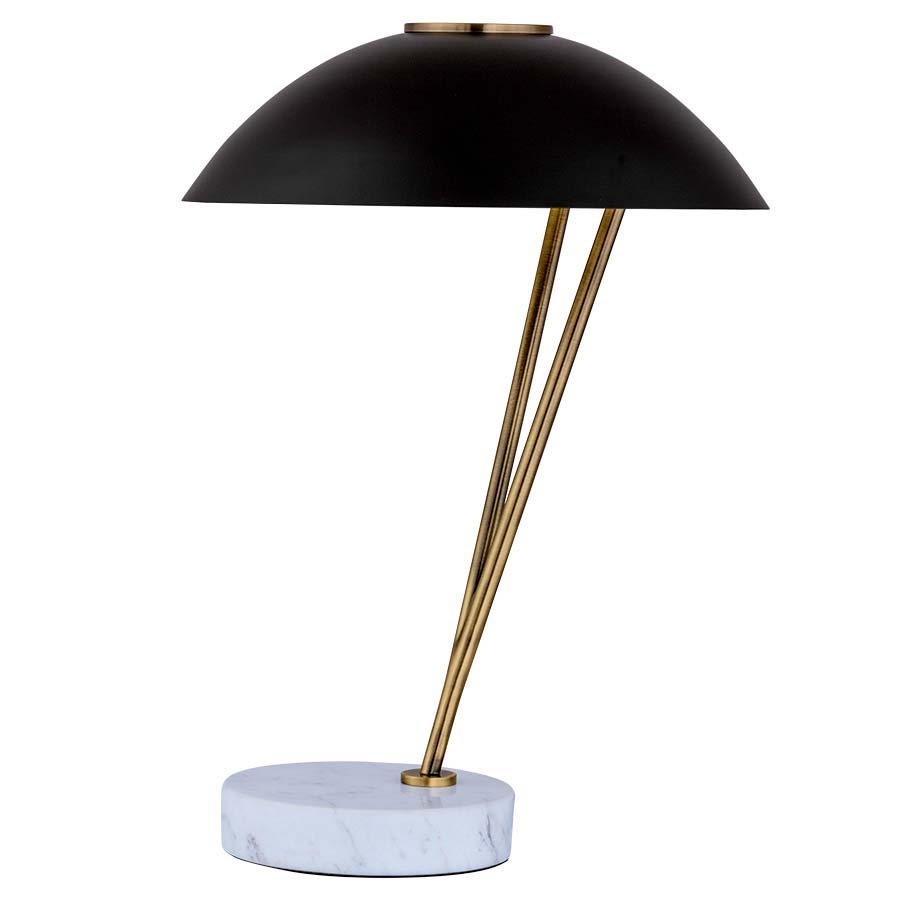 20"H Brass and White Marble Stone Table Lamp, medium base socket, on/off rocker switch on cord, 6' Black SPT-2 cord, Black Metal Shade, recommend 800 lumen LED bulb