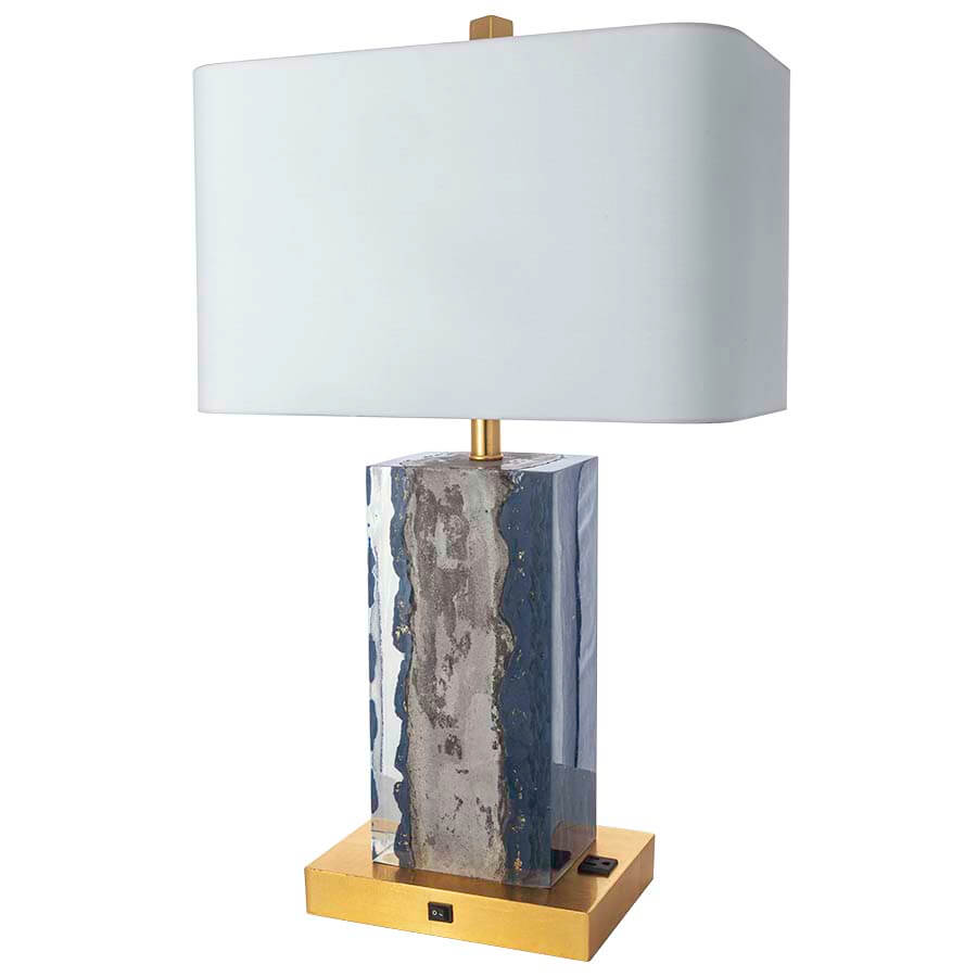 26"H Cement Oxide Gold and Newbury Port DE5881 Resin and Brass Table Lamp, medium base socket, round rocker base switch, one outlet, 8' Gold 3-Prong Grounded Cord, 10x18x10x18x11 Rectangle White Linen Hardback Shade, recommend 1100 lumen LED bulb
