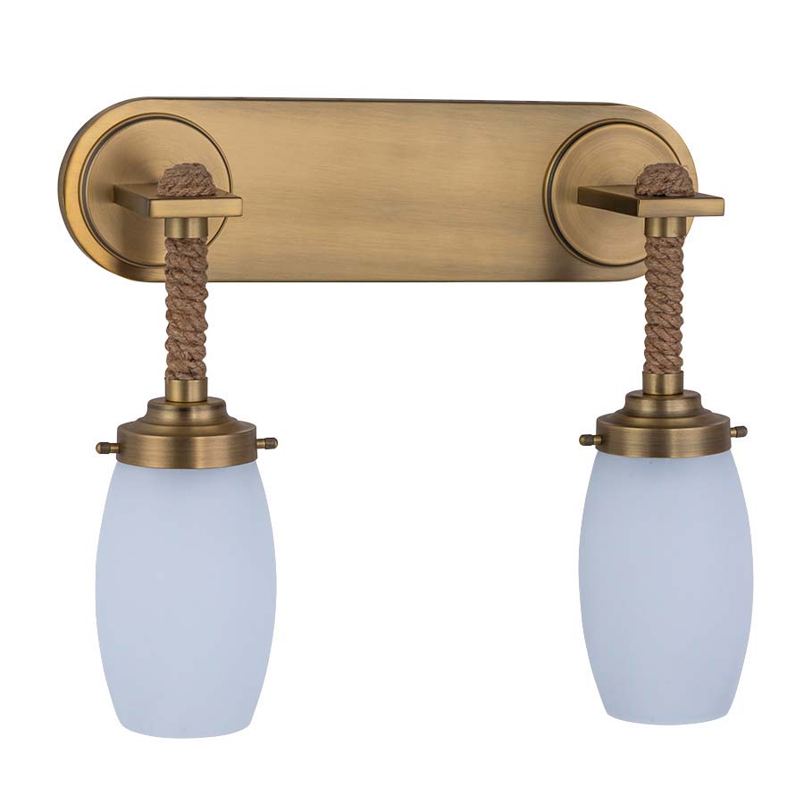 16.25"H Antique Brass Double Wall Lamp with Rope Wrapped metal rods, two medium base sockets, two 10' Silver SPT-2 cords exiting out back of lamp, two Clear Frosted Acrylic Shades, recommend two 1100 lumen LED bulbs