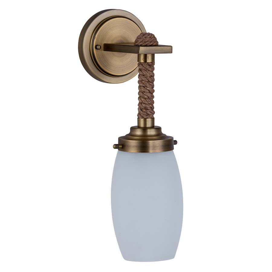 16.25"H Antique Brass Wall Lamp with Rope Wrapped metal rod, medium base socket, 10' Silver SPT-2 cord exiting out back of lamp, Clear Frosted Acrylic Shade, recommend 1100 lumen LED bulb