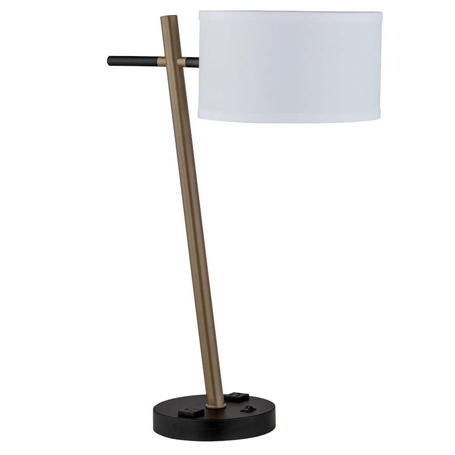 24" Sungold and Matte Black Table Lamp, medium base socket, on/off rocker base switch, two outlets,8' Silver 45° 3-prong grounded cord, 10"x10"x6" White Linen Hardback Shade with top and bottom acrylic diffusers. Recommend 1100 lumen LED bulb.