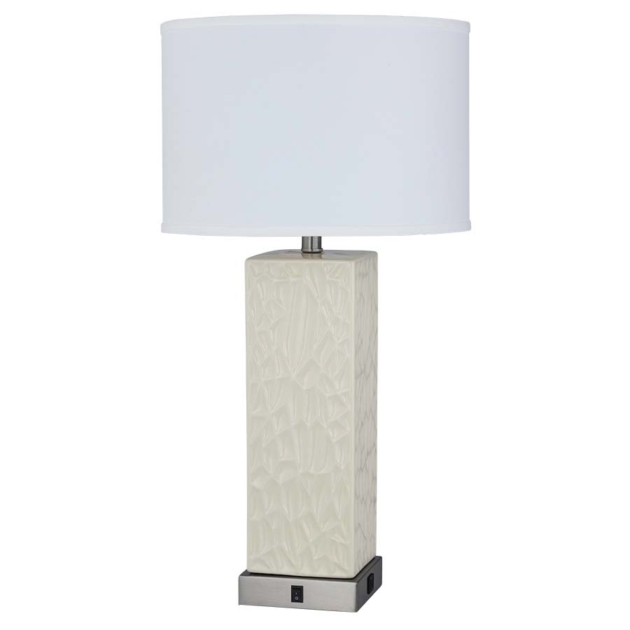 28"H White Swan and Brushed Nickel Table Lamp, medium base socket, on/off rocker base switch, one outlet, dual USB port, 8' Silver 45° 3-prong grounded cord, 15"x15"x10" White Linen Hardback Shade, recommend 1100 lumen LED bulb