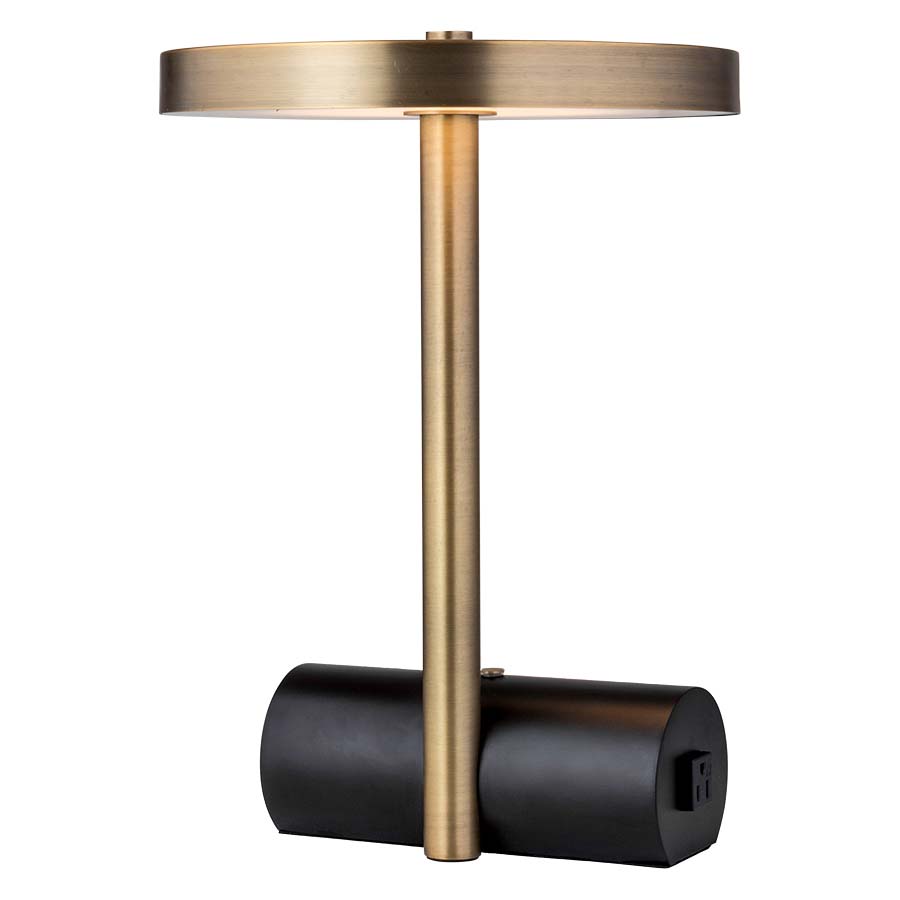 17"H Brushed Brass and Pottery Bronze Integrated LED Table Lamp, 24 watt LED, 2400 lumen, 3000K, 90CRI, touch dimmer base switch, one outlet, dual USB port, 8' Silver 45° cord, Brushed Brass Metal Shade with White Frosted Acrylic Bottom Diffuser.