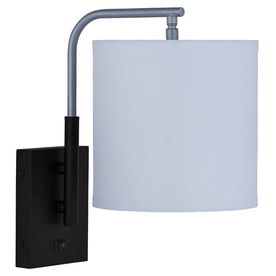 13"H Matte Black and Metallic Silver Wall Lamp, medium base socket, on/off rocker switch at backplate, 8' Silver 45° cord exiting out back of lamp, 8"x8"x8" White Linen Hardback Shade with bottom acrylic diffuser, recommend 1100 lumen LED bulb