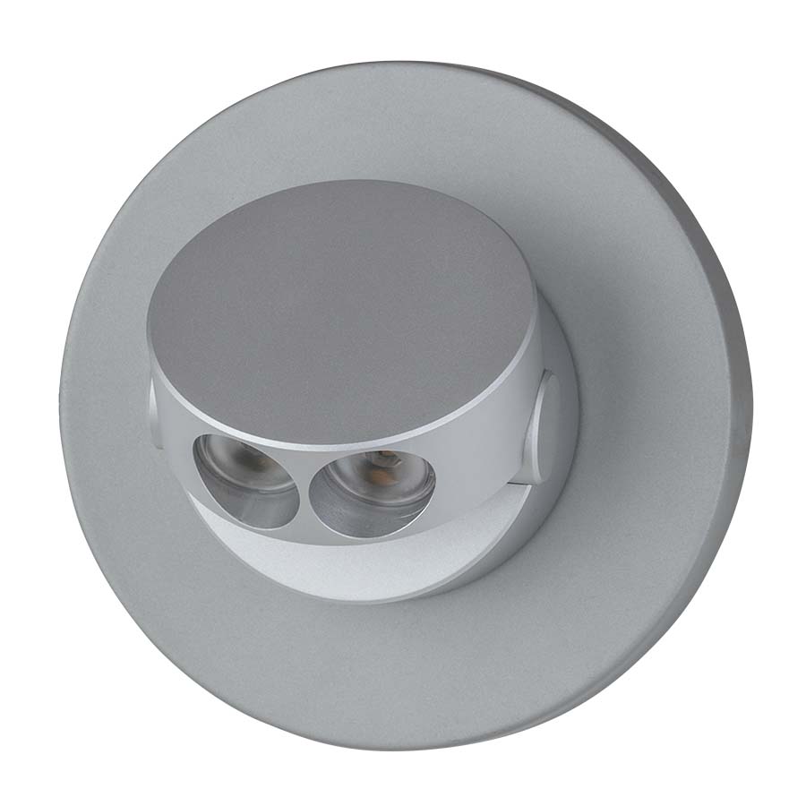 5" diameter Silver Aluminum Integrated LED Wall Lamp, two 3 watt, 200 lumens, 80CRI, 4000K, 45° beam angle, direct wired